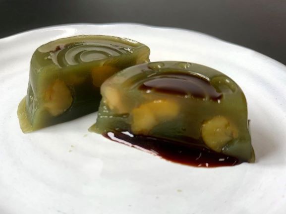 大きな甘蜜漬の栗や、甘蜜漬けの小豆も入った、抹茶味の水ようかんです。