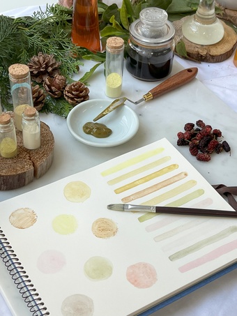 草木を煮出して作る「草木顔料」と、額田地域で採れる片麻岩を砕いて作る「鉱物顔料」の2コースから選んで体験いただけます。