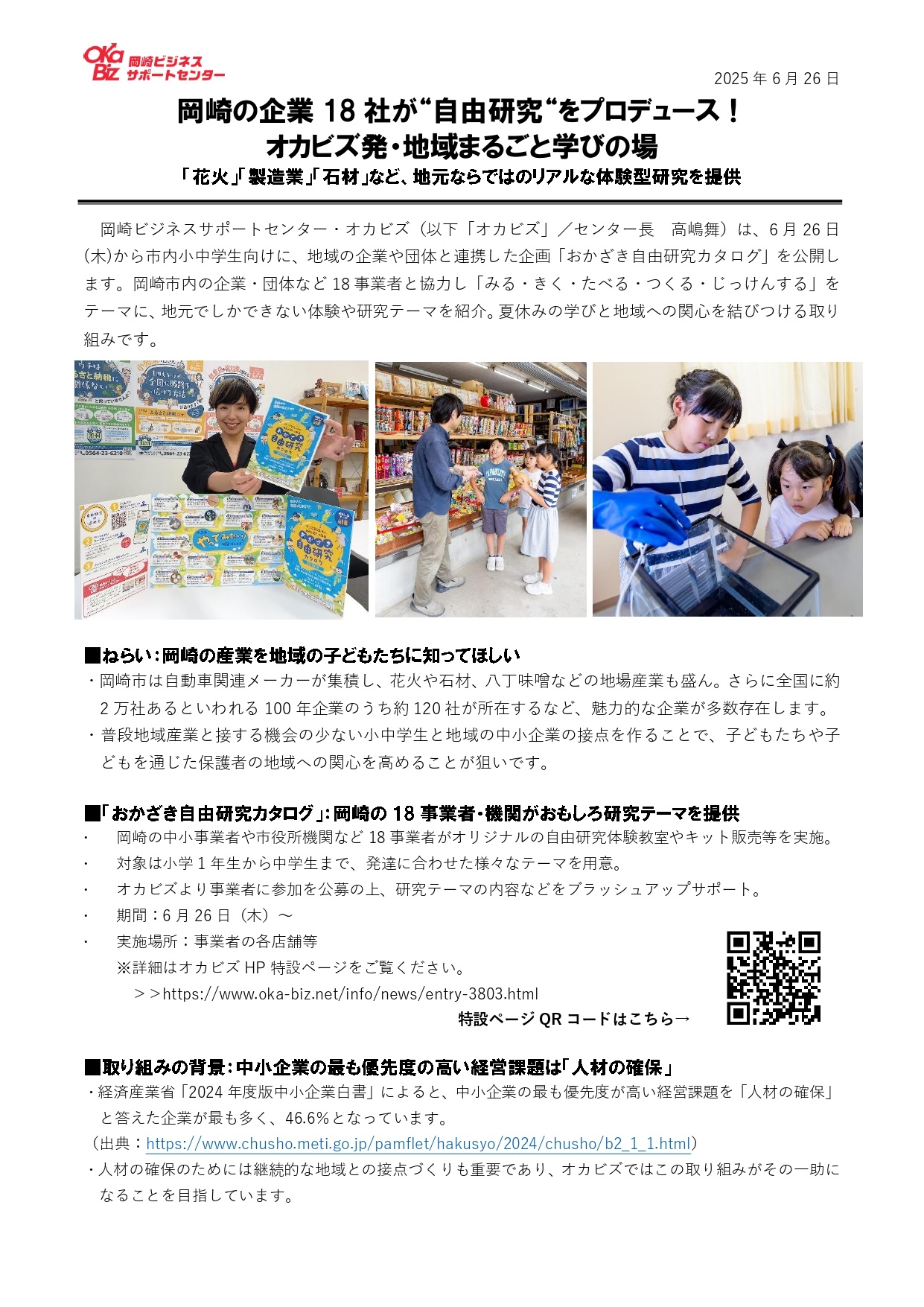 プレスリリース < お知らせ - 2025年06月26日 岡崎の企業18社が“自由研究“をプロデュース!オカビズ発・地域まるごと学びの場 「花火」「製造業」「石材」など、地元ならではのリアルな体験型研究を提供
